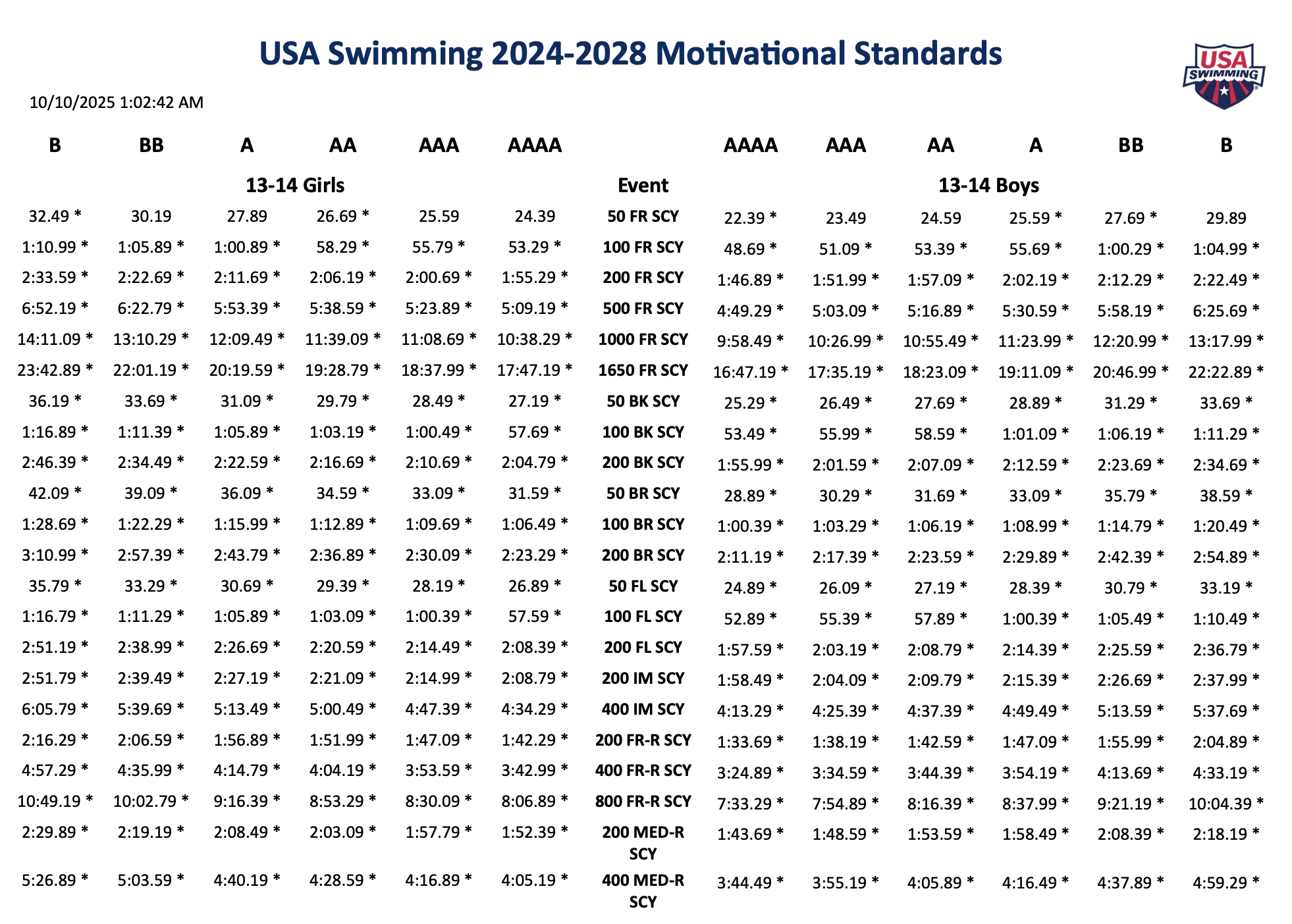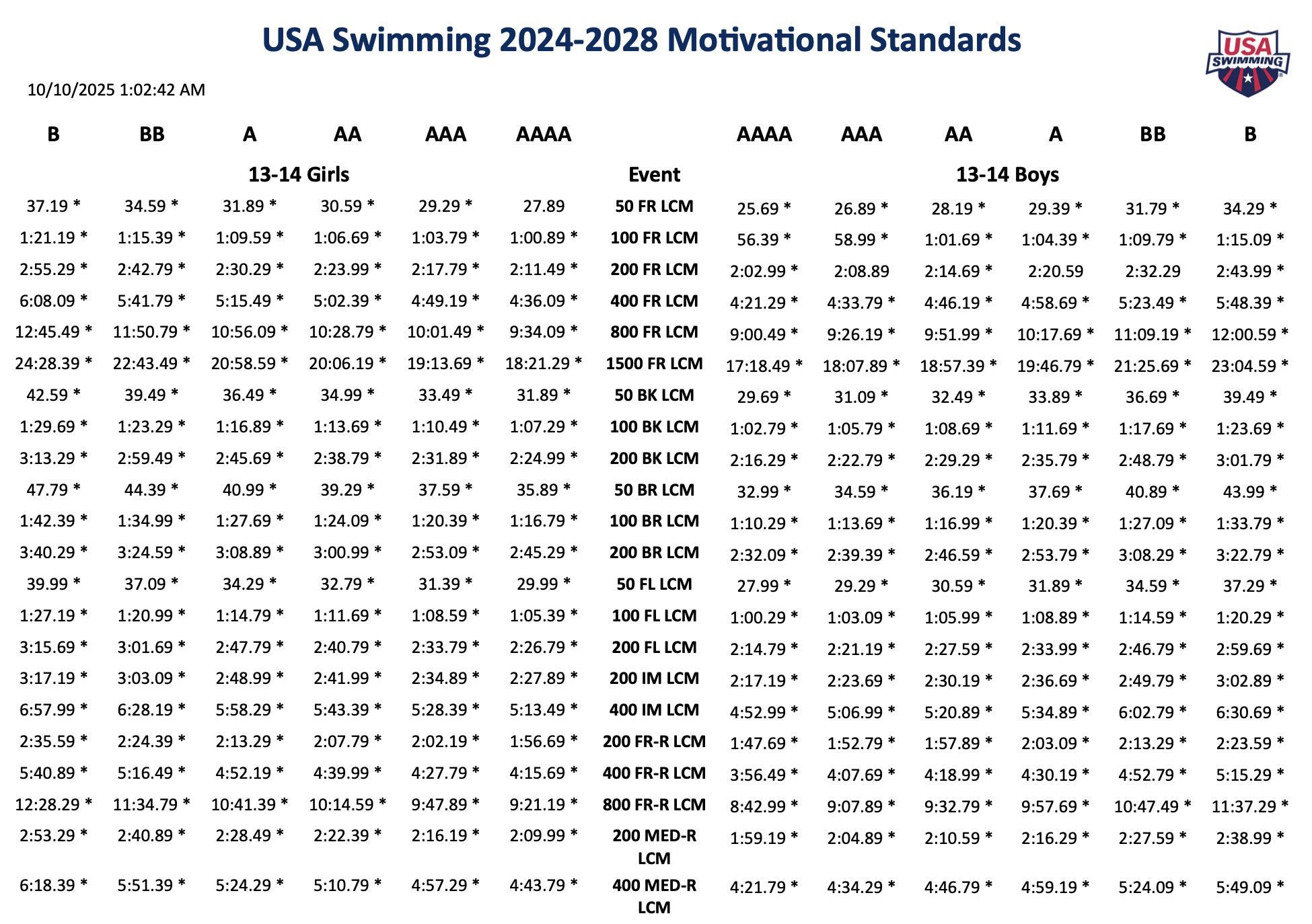 Pro Swim Series Time Standards